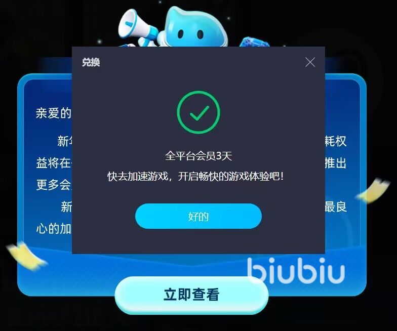 新人的福利太短了,還有其他福利獎勵嗎?今天小編給大家準(zhǔn)備了暗號兌換獎勵,去首頁右下方的兌換入口令輸入進(jìn)去,直接就能領(lǐng)到72小時的時長獎勵,暗號是【biubiu不卡頓】注意字母的大小寫,同時每位用戶只能夠領(lǐng)取一次。足足96小時的時間足夠讓你愛上biubiu這款加速器。