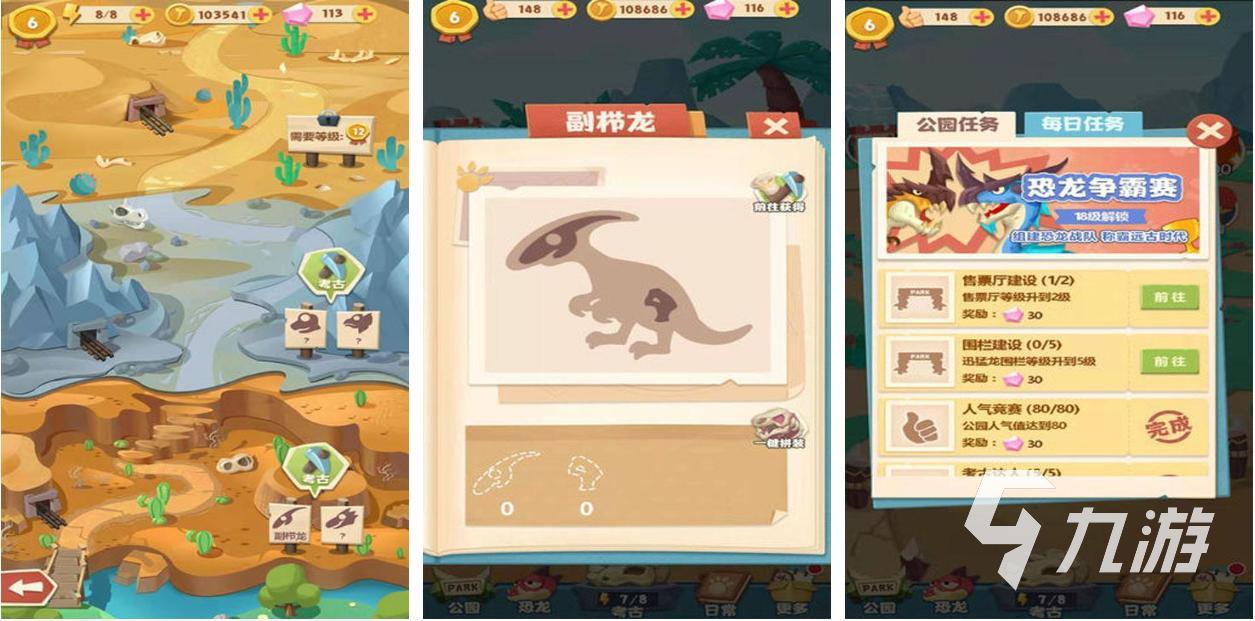 這款游戲利用了一點(diǎn)點(diǎn)科幻性??铸堖^去是地球的強(qiáng)大統(tǒng)治者,但因?yàn)橐恍┎恢脑蜾N聲匿跡,此番有技術(shù)可以利用化石來把恐龍復(fù)活,當(dāng)然要好好養(yǎng)一下。你將管理這個(gè)恐龍公園,讓人們前來參觀,具體包括探索化石、合成恐龍、獲得更高級別恐龍等幾個(gè)部分,哪怕掛機(jī)也能玩。