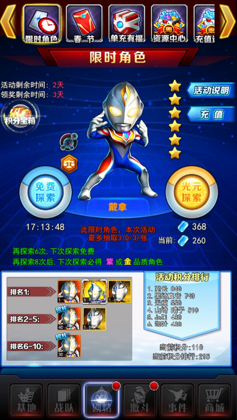 本款游戲當(dāng)中將登場大量傳奇奧特曼,這些傳說當(dāng)中的奧特曼不僅戰(zhàn)斗力強(qiáng)大,玩家們還可以直接通過游戲召喚來獲取。游戲內(nèi)還有豐富的任務(wù)系統(tǒng)等待著大家去了解,趕緊行動起來。