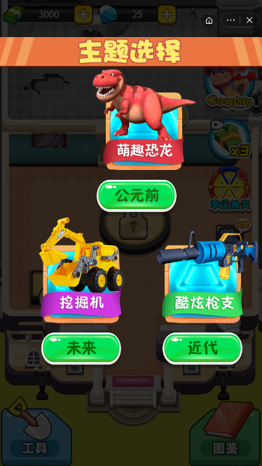 游戲里還有多種主題可以選擇,看看大家更加偏好那種時期進行游戲呢,可以選擇公元前的萌趣恐龍主題,感受各種各樣神奇的恐龍玩具;還有未來世界的主題,從未來世界當中體驗各種先進的挖掘機等的玩具;甚至還有近代主題,又各種炫酷的槍支玩具可以感受,總之在不同的主題當中都有豐富的體驗與感受。