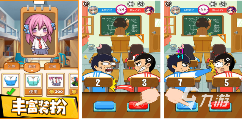 同桌大作戰(zhàn)是款非常適合雙人一起體驗的分屏競技小游戲,兩個玩家都要化身中學(xué)生在座位上打打鬧鬧,通過快速點擊屏幕上的按鍵可以讓角色快速攻擊,兩個玩家在戰(zhàn)斗的同時需要躲避老師的視線,考驗反應(yīng)能力和手速的游戲方式讓人欲罷不能,豐富的裝扮和獨一無二的玩法讓本作脫穎而出,青春的學(xué)生形象和真實的教室景象很有年代感。